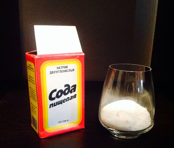 - Налить в стеклянную емкость теплую воду (400 мл), растворить в ней соду (4 ст. л).