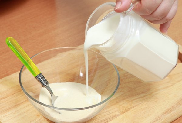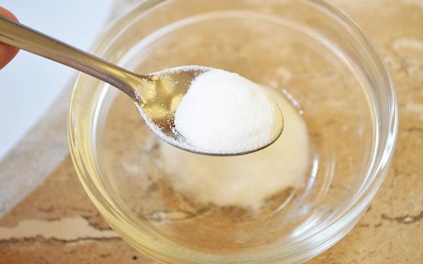 - Налить в небольшую стеклянную или керамическую посуду одну столовую ложку подогретой воды.
